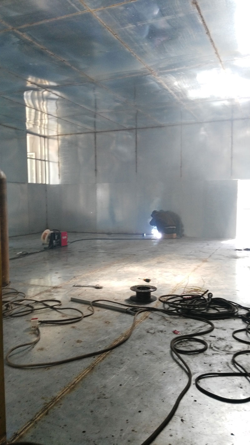 1、殼體:有六面板體、支撐龍骨及殼體與地面進(jìn)行絕緣處理,其中頂、墻板采用厚度為2mm的冷軋鋼板,地板采用厚度為3mm的冷軋鋼板;焊接工藝為CO,保護(hù)焊。